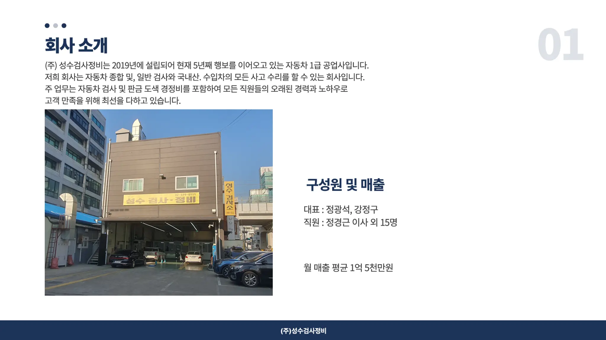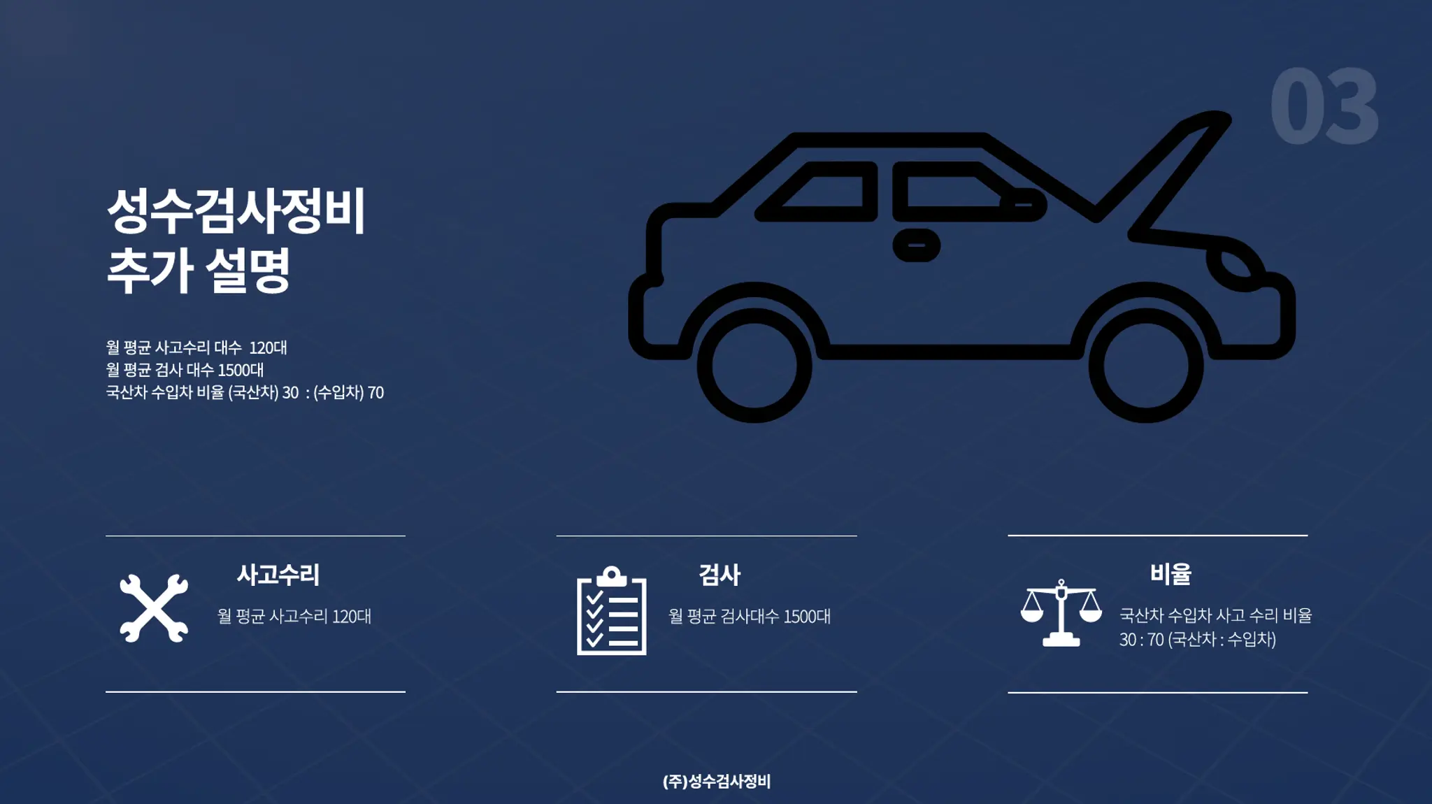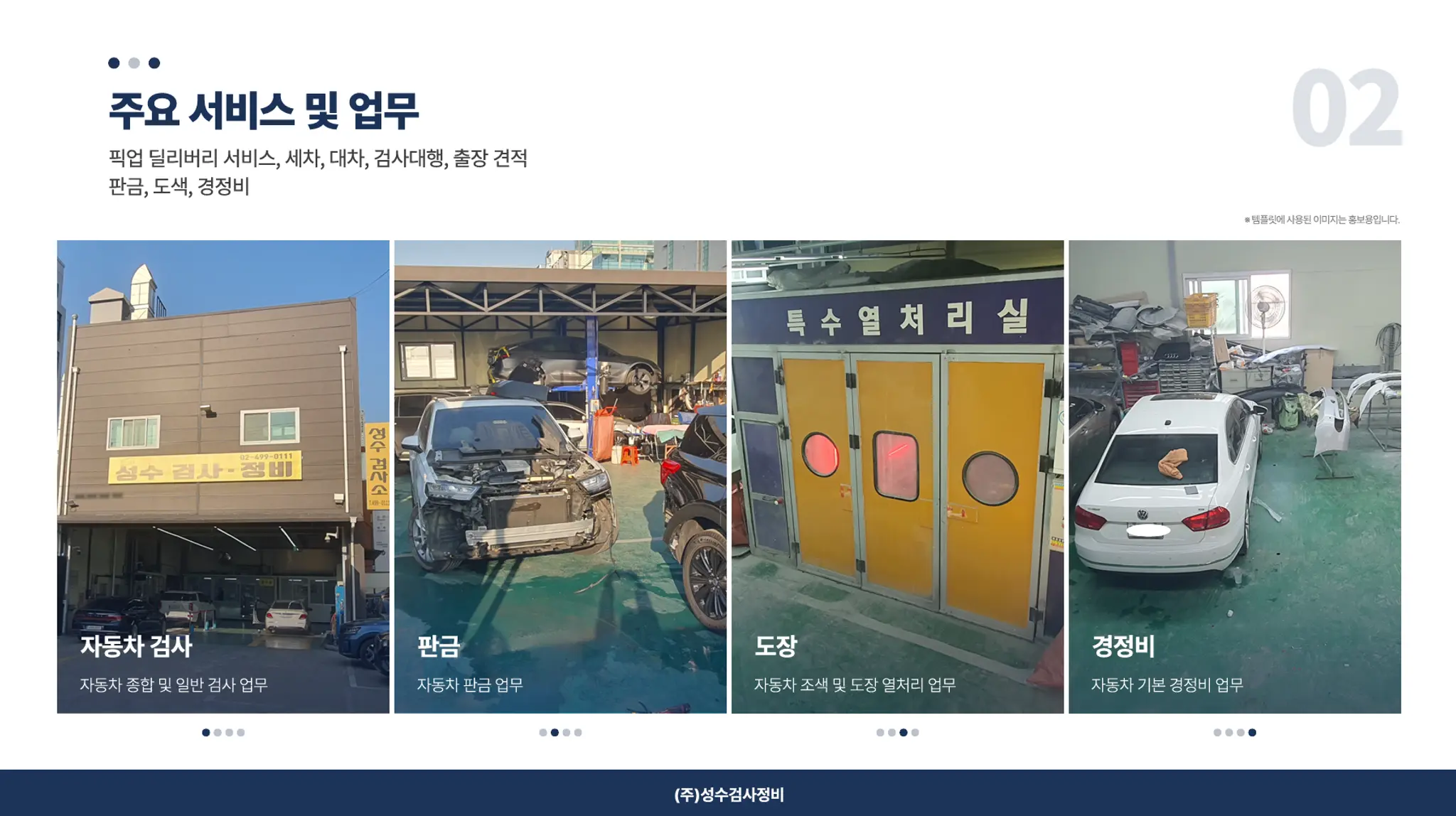 안녕하세요. 1급 자동차 공업사 『주식회사 성수검사정비』 입니다!! 저희 성수검사정비는 성수역에서 도보 5분 거리에 위치하여 쉽게 방문하실 수 있습니다! 도장 도료는 벤츠, BMW, 포르쉐 등 외제차 공식 서비스센터에서 사용하는 정품 글라슈리트 도료를 동일하게 사용하며, 뛰어난 정비 실력과 최신식 설비가 완비되어 있으므로 정비에서 검사까지 모두 한 번에 가능합니다. 다양한 경험을 바탕으로 교환, 교체 보다는 판금 위주로 작업함으로써 차량 감가를 최소로 하여, 고객님의 소중한 차량을 복원해드립니다. ★ 카닥을 통해 입고 시 제공 서비스 ★ ☆ 무료 출장 1:1 견적 및 상담 서비스 ☆ 무료 픽업 & 딜리버리 서비스 ☆ 무료 세차 서비스 ☆ 수리 부위 광택 서비스 ☆ 1년 무상 A/S ☆ 검사 대행 서비스 ☆ 성동구 지정 검사소 보유 ☆ 경정비 / 판금 / 도장 / 검사소 부서 별 분담 전문 서비스 ☆ 외제차 센터급 재료 및 도장 도료 사용